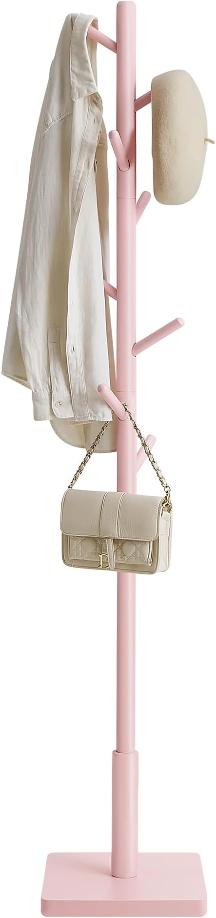 VASAGLE Solid Wood Coat Rack, Free Standing Hall Coat Tree with 8 Hooks, 3 Height Options, for Coats, Hats, Bags, Purses, for Entryway, Hallway, Rubberwood Hooks and Pole, Jelly Pink URCR010R01