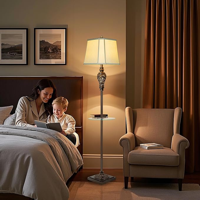 - STURDY GLASS TRAY: The 12" round tray is made of tempered glass, which is sturdy and easy to clean. Combining the functions of floor lamp and side table to save space in the room. You can place your phone, coffee mug, books or decorations, etc.