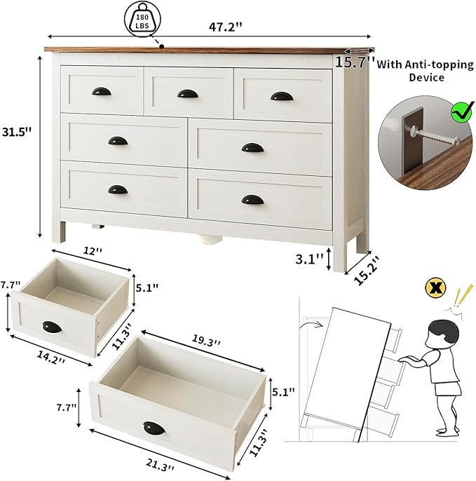 - 7 DRAWER WHITE NURSERY DRESSER: This antique dresser is 47.2 inches x 15.7 inches x 31.5 inches with seven large drawers, each 5.5 inches deep. It's ideal for organizing clothing, documents, jewelry and personal items, while the wide tabletop provides space for lamps, aromatherapy, picture frames, plants and decorative items. Simplify your living space, maintain order and infuse your room with warmth