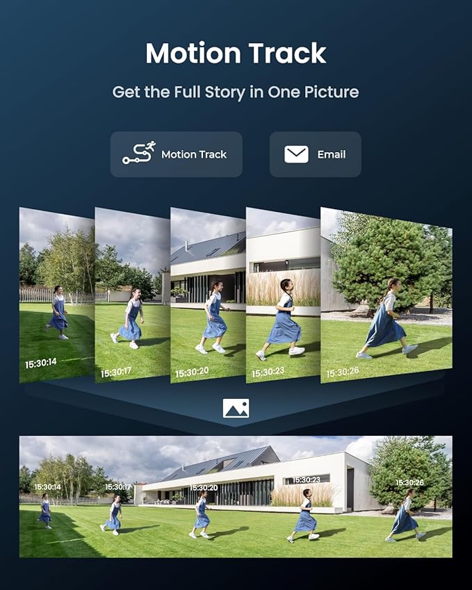 - 180° PANORAMA & MOTION TRACK: Thanks to dual-image stitching algorithms, the dual lens camera presents a complete 180° panorama with minimal distortion. Its Motion Track feature displays the complete movement of the target over time in one frame for effortless monitoring.