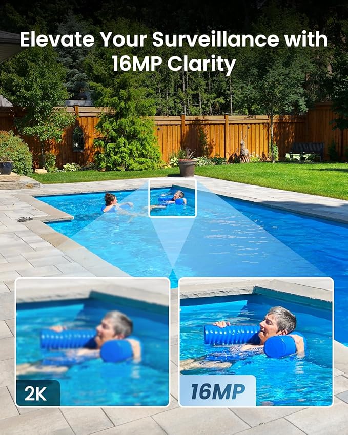 - 16MP UHD VIEW & TWO NIGHT VISION MODES: Featuring two 4K image sensors, this outdoor security camera brings 16MP ultra-clear visuals. With 8 spotlights and an F1.6 large aperture, it captures details in vivid colors, even at night. Switch to IR night vision to match your needs.