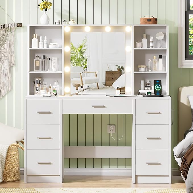 Makeup Vanity Desk with Mirror,10 Lights and Power Strip,Large Makeup Vanity with Shelves and 7 Drawers, Vanity Desk Dressing Table with 3 Color Adjustable Light,Vanity Table (White)