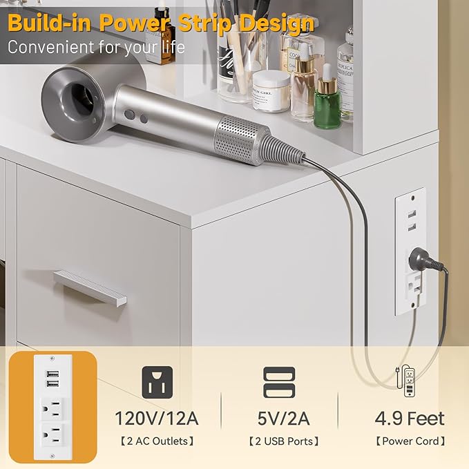 - Makeup Vanity With Charging Station: This vanity desk comes with 2 USB ports and 2 standard plug sockets on the side, immediately after applying makeup, you can use the curling iron and hair dryer to create a beautiful look that matches your makeup without having to look for a limited power source.
