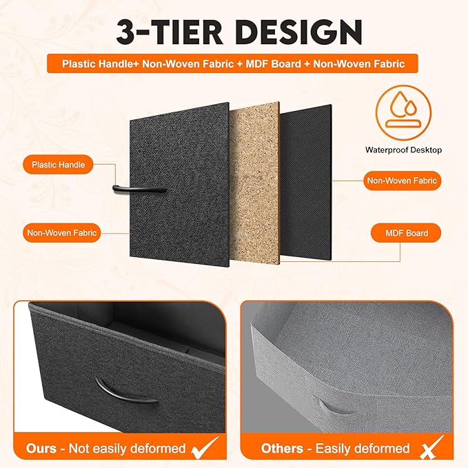 - Durable Material - This dresser storage organizer is made of non-woven synthetic fiber, harmless and wear-resistant. Strong steel frame and water-resistant wood top offer stable support. Easy-pull drawers with plastic handles for smooth opening and closing.