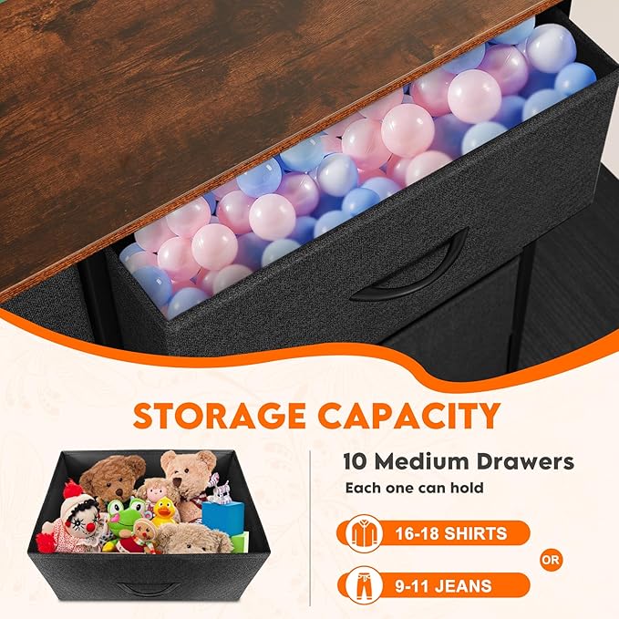 Dresser for Bedroom with 10 Drawers, Chest of Drawers, Storage Drawers Organizer Unit, Black Wide Fabric Dresser with Fabric Bins for Closet, Living Room, Entryway (Black and Rustic Brown)