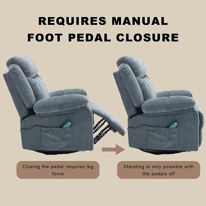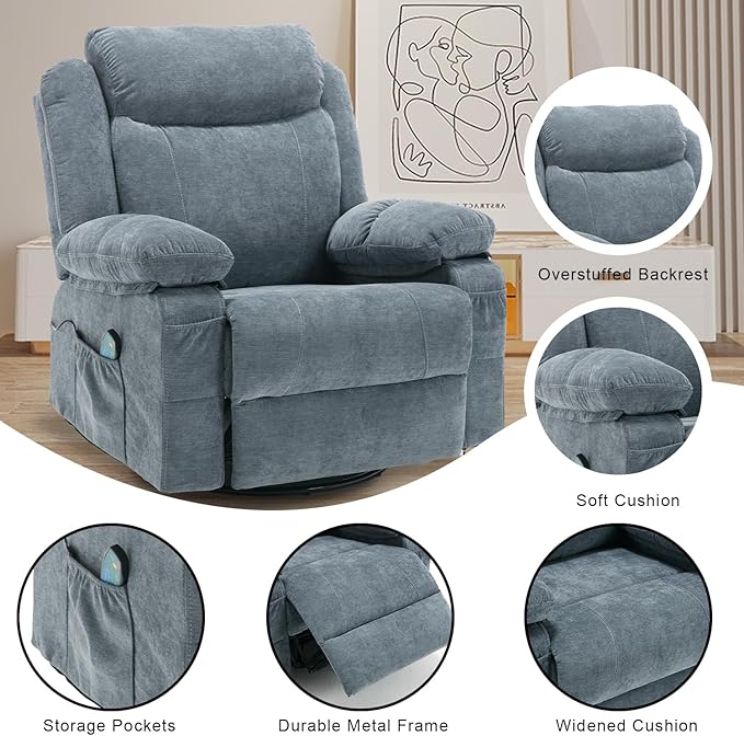 - 【ROCKER SWIVEL CHAIR】 This fabric massage recliner has a 30-degree rocking function. A rocker recliner is also a favorite with nursing mothers because it provides comfort for the mother while the rocking motion relaxes the baby. A 360°swiveling base allows you to pivot and face any direction you desire. Weight Capacity: 300lbs.