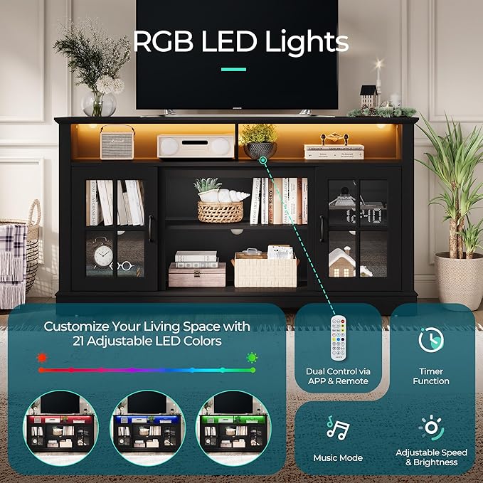 - LED TV Stand - Immerse yourself in our LED TV stand with 6 vibrant colors and 22 dynamic flashing modes. Easily controlled by remote or app, you can adjust the lighting to suit any mood or occasion. Enhance your entertainment experience during Christmas, Halloween and other major holidays