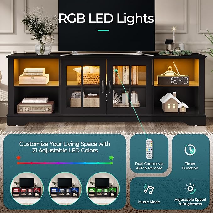LINSY HOME TV Stand for 75 Inch TV, 68" Entertainment Center with LED Lights and Glass Door Storage Cabinet, Modern Farmhouse TV Media Console Table for Living Room, Black