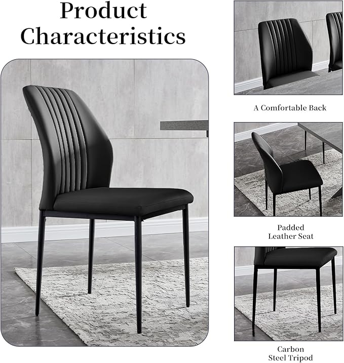 - 4. About Modern Dining Chair: This Leather dining chair is made of high-quality PU leather wrapped with high elastic sponge, which is comfortable and easy to clean. U-shaped cushion relaxes your hip muscles, carbon steel legs will not deform.