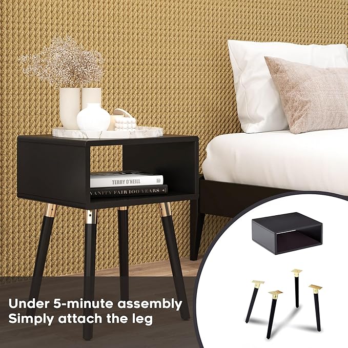 Bme Dinkee Solid Wood Nightstand, Fully Assembled, Without Drawer for Mid Century Bedroom and Living Room, Black