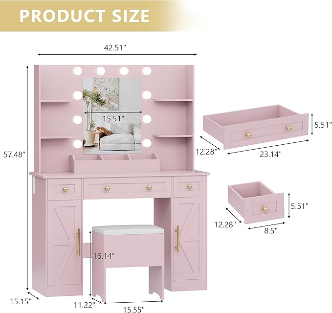 - 【Large Capacity】The size of the vanity desk with mirror and lights is 43.3×15.75×57.5 inch/ 110×40×146 cm(L×W×H) and weighs 105 lbs/ 47.7 kg. The makeup vanity is combined by SIX parts: 2+1 drawers, 4 open storage areas, 2 cabinets with adjustable shelves, 3 makeup trays, a wide desktop and a cushioned stool. It can help you to classify and store your items, so that you will have a tidy and clean room