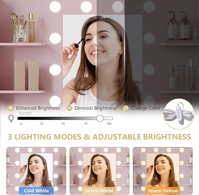 - 【3 Color Lighting Modes】The vanity desk is equipped with a big mirror. Surrounding the mirror, there are 10 Hollywood bulbs, providing 3 color modes (warm/natural/cool) and brightness adjustable, this makeup vanity can meet all your different needs, perfect for home makeup, salon, and live broadcast. So you can experience the star-like makeup treatment