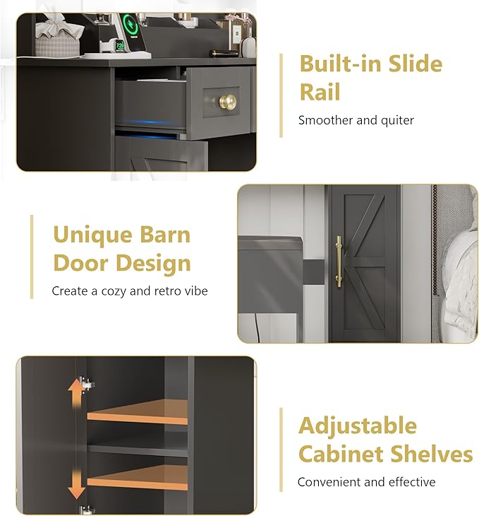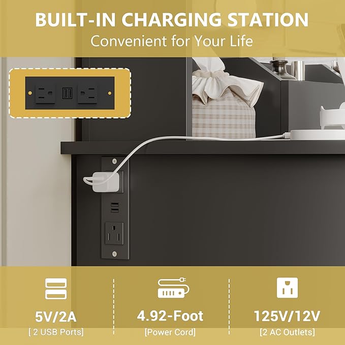 - 【Built-in Charging Station】The vanity is equipped with a built-in charging station, including 2 AC outlets and 2 USB ports, through which you can charge and use electronic devices at the same time