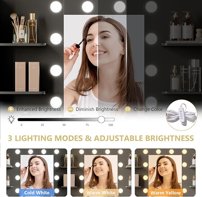 - 【3 Color Lighting Modes】The vanity desk is equipped with a big mirror. Surrounding the mirror, there are 10 Hollywood bulbs, providing 3 color modes (warm/natural/cool) and brightness adjustable, this makeup vanity can meet all your different needs, perfect for home makeup, salon, and live broadcast. So you can experience the star-like makeup treatment