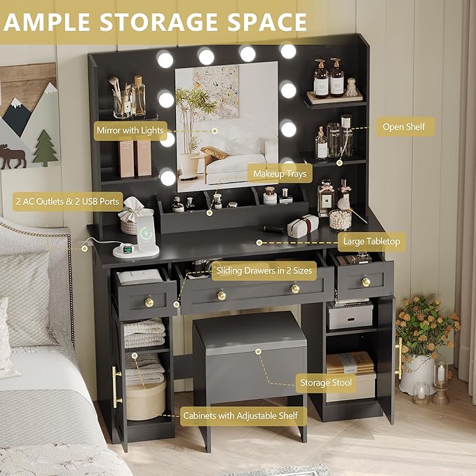 - 【Large Capacity】The size of the vanity desk with mirror and lights is 43.3×15.75×57.5 inch/ 110×40×146 cm(L×W×H) and weighs 105 lbs/ 47.7 kg. The makeup vanity is combined by SIX parts: 2+1 drawers, 4 open storage areas, 2 cabinets with adjustable shelves, 3 makeup trays, a wide desktop and a cushioned stool. It can help you to classify and store your items, so that you will have a tidy and clean room