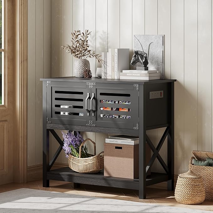 - 【Rustic Style】 Black entryway table with storage creates a rustic style that adds a style to your space. Black pulls and sheet iron corner guards on the door panels add a touch of sophistication to your furniture