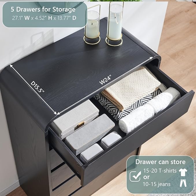 Modern 5 Drawers Dresser for Bedroom, 45" Tall Dressers & Chests of Drawers w/Curved Profile Design, Wood Mid Century Vertical Dresser w/Natural Texture for Bedroom, Living Room, Black