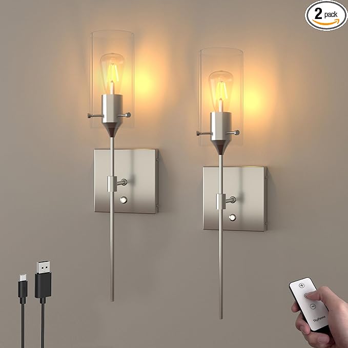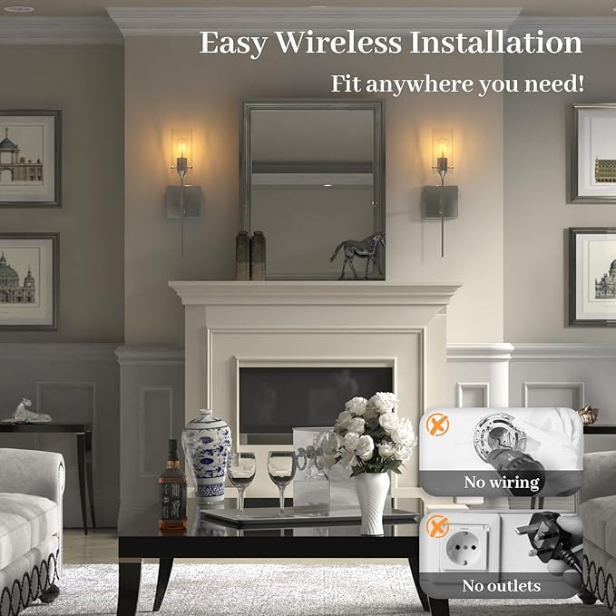 - 【No Wiring Install & Widely Applicable】The rechargeable battery operated wall sconces set of 2 glows a sufficient brightness, which can provide extra lighting, especially during a power outage. Perfect for living room, bedroom, dining room, bathroom, hallway, staircase, porch, kitchen, front of vanity desk and other home areas.