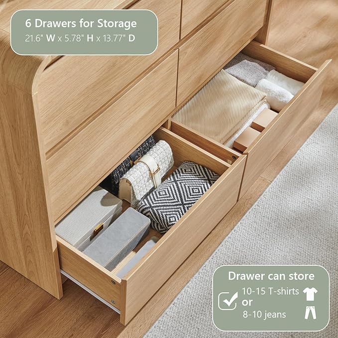 Modern 6 Drawers Dresser for Bedroom, 47" Wide Wood Dressers & Chests of Drawers w/Curved Profile Design, Mid Century Modern Dresser w/Natural Texture for Bedroom, Living Room, Natural Oak