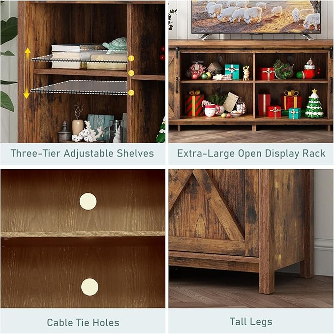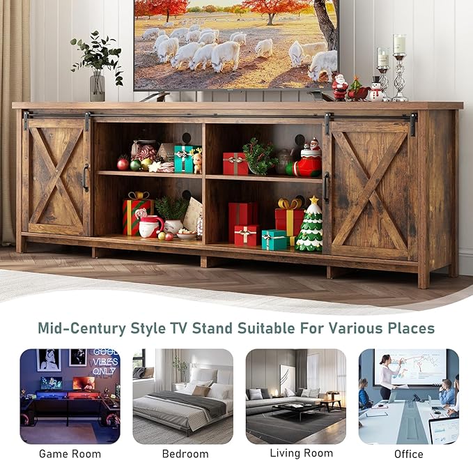 - Farmhouse style entertainment center : The TV stand with storage cabinet featured two sliding barn doors for a blend of open and closed storage. Sliding barn doors and their flexibility allow easy access to all cabinets. Beyond its functionality, the symmetrical design with the finest wood grain also matches the rustic sense of style.