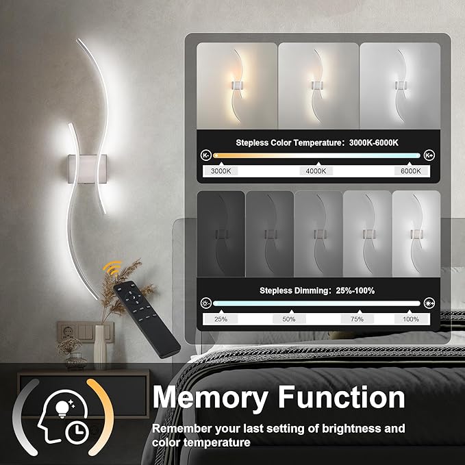 - Adjustable Colors & Brightness,Memory Function: You can choose different color temperature modes (3000K-6000K) through the remote control according to your needs, and adjust the brightness you want (20%-100%) . The color temperature and brightness can be infinitely adjusted. Memory function can remember your last color and brightness setting. So you don't need to adjust the color and brightness every time.In addition, the remote control also comes with a night light and timing function, allowing you to read without disturbing your partner's sleep