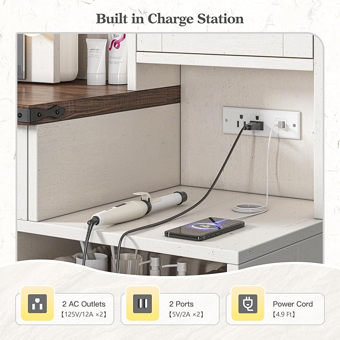- 【Stylish and Functional】This makeup vanity desk comes with a power strip and a sliding mirror that can be adjusted freely to your desired position. It includes 2 standard outlets and 2 charging ports, allowing you to easily access and charge your devices.