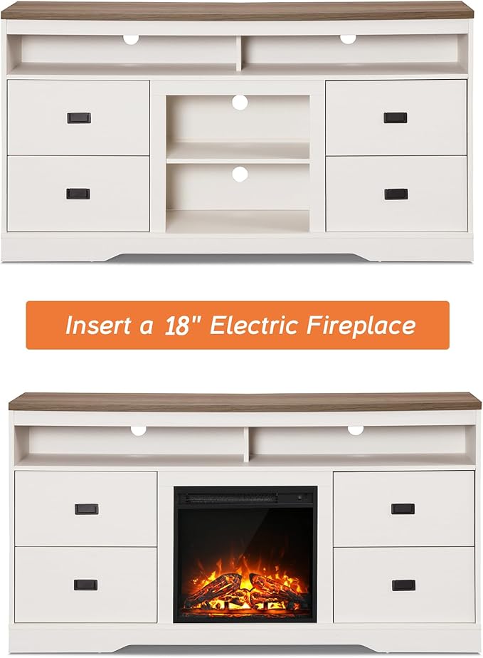 - Ample and Flexible Storage: This television stand comes with 4 drawers, with a 3-level adjustable and removable shelf to assembly the electric fireplace . Open storage compartments at the top for the CDs, DVDs, gaming box, decorations, etc..Each beside storage cabinet has adjustable end shelves which offer extra storage