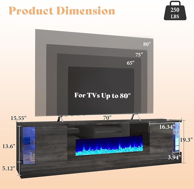 - [Dimensions & Specifications] TV Stand: 70"Wx19.3"Hx15.6"D, Electric Fireplace: 36"Wx13.7"Hx4.9"D. TV stand fits TVs up to 80" & 250lbs. Clear & detailed assembly instructions included, total includes 2 cartons & possibly delivered on separate days
