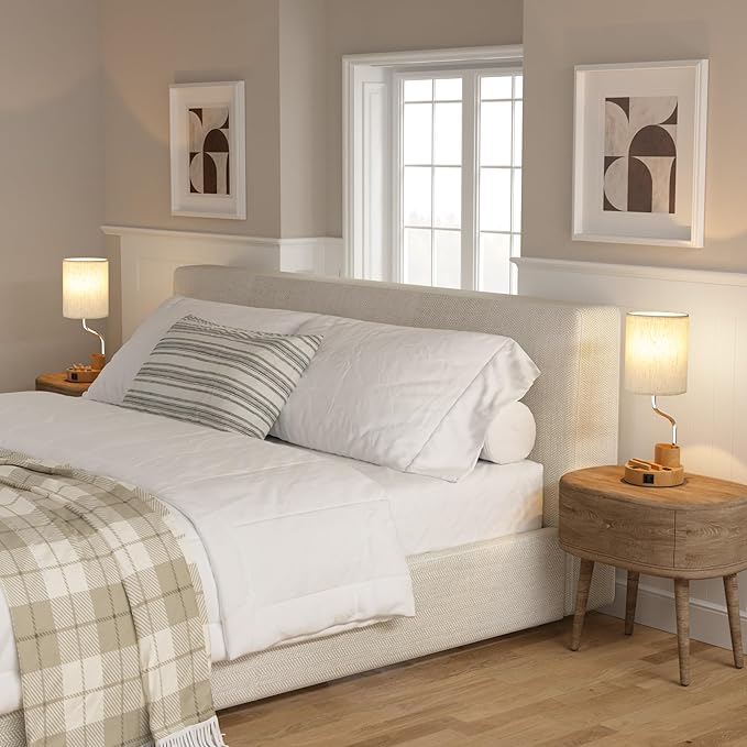 - 4. Plug and Play Modern Bedroom Lamps Set: With a wooden base and a chic cream shade, this night stand lamp complements any decor. Its modern stylish design is perfect for both home and office settings, blending effortlessly with various styles and color schemes. An ideal tableside lamp for bedroom, guest room, living room, study room, kids room, college dorm room for girls and boys, office room, desk, etc