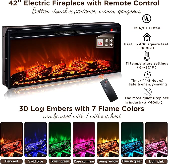 - [7 Customizable Ambiances]: 7 adjustable colors of flame & LED lighting. Transform your home into a cozy retreat with our 42" luxurious electric fireplace! Featuring a stunning 3D faux log design and 7 vibrant flames, it's the perfect focal point for any room. The best part? The flame effects and temperature controls work independently, allowing you to enjoy the ambiance year-round without any heat! Say goodbye to a boring room and hello to a stylish & warm bay