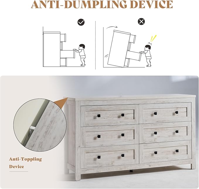 AMERLIFE 6 Drawer Dresser for Bedroom, 54" Wide Dresser TV Stand with Large Drawers, Farmhouse Wood Chest of Drawers with Vintage Grain Texture, Distressed White