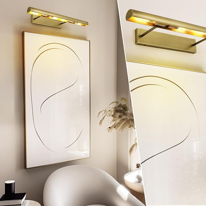 - 【PERFECT FOR ANY SPACE】Our brushed gold picture lights provide an elegant ambient lighting vibe, which is your best choice for illuminating paintings, posters, and portraits. Our gold picture lights are perfect for galleries, living rooms, dining room or bathrooms. Transform your space with our display light for artwork, bringing focus and elegance to your beloved paintings or pictures.