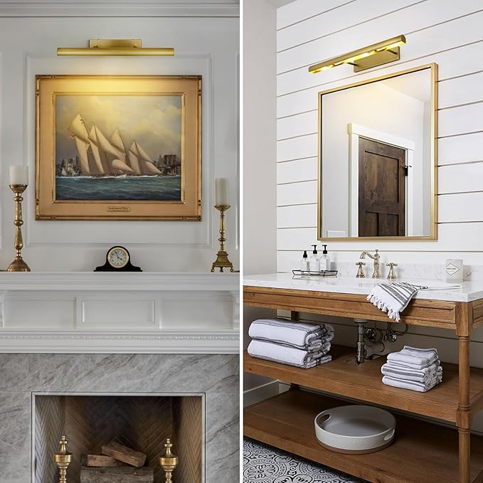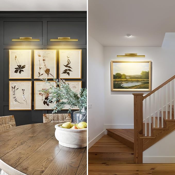 - 【PERFECT FOR ANY SPACE】Our brushed gold picture lights provide an elegant ambient lighting vibe, which is your best choice for illuminating paintings, posters, and portraits. Our Gold Picture Lights are perfect for galleries, living rooms, dining room or bathrooms. Transform your space with our display light for artwork, bringing focus and elegance to your beloved paintings or pictures.