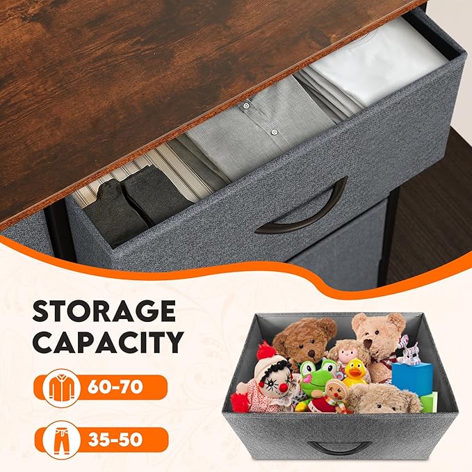 Dresser for Bedroom with 10 Drawers, Chest of Drawers, Storage Drawers Organizer Unit, Grey Wide Fabric Dresser with Fabric Bins for Closet, Living Room, Entryway (Grey and Rustic Brown)