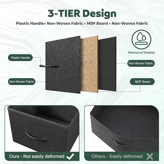 - Durable Material - This dresser storage organizer is made of non-woven synthetic fiber, harmless and wear-resistant. Strong steel frame and water-resistant wood top offer stable support. Easy-pull drawers with plastic handles for smooth opening and closing.