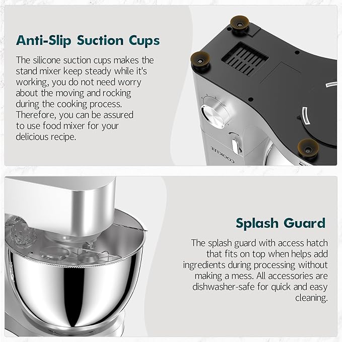 - 9.5-QUART HIGH CAPACITY - Large stainless steel mixing bowl offers enough capacity. Each COOKLEE kitchen Electric mixer comes with a dough hook, flat beater, wire whip, and pouring shield avoiding mess kneading process.