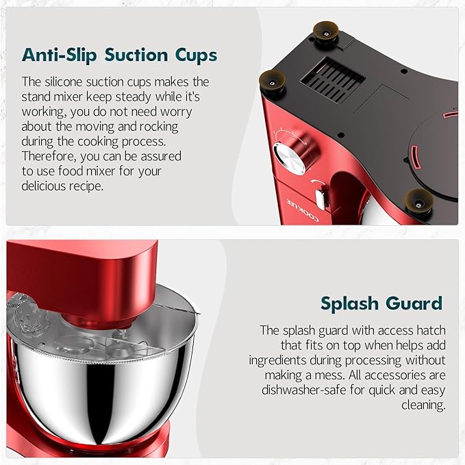 - 9.5-QUART HIGH CAPACITY - Large stainless steel mixing bowl offers enough capacity. Each COOKLEE kitchen Electric mixer comes with a dough hook, flat beater, wire whip, and pouring shield avoiding mess kneading process.