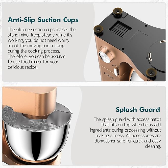 - 9.5-QUART HIGH CAPACITY - Large stainless steel mixing bowl offers enough capacity. Each COOKLEE kitchen Electric mixer comes with a dough hook, flat beater, wire whip, and pouring shield avoiding mess kneading process.