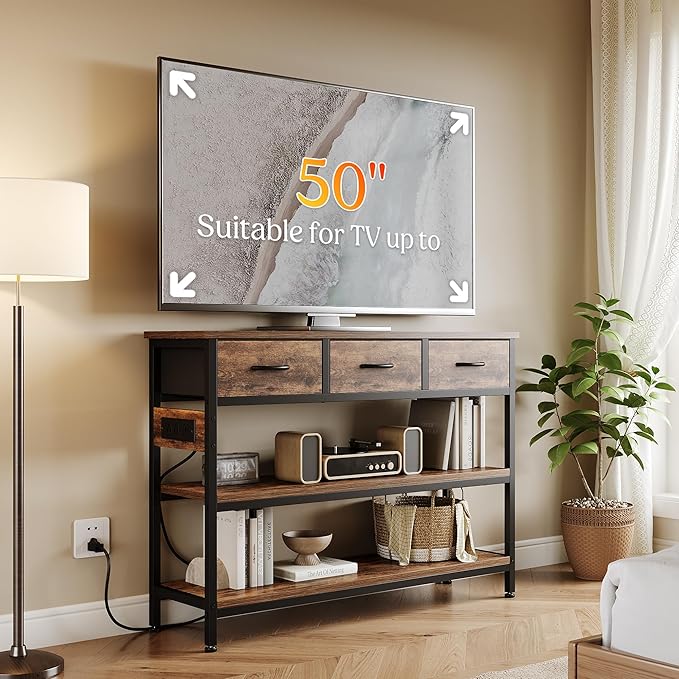 Lulive Entryway Table with Power Outlets, Console Table with 3 Fabric Drawers, Sofa Table for Living Room, Hallway, Couch, Foyer, Height Adjustable (Rustic Brown, 43")