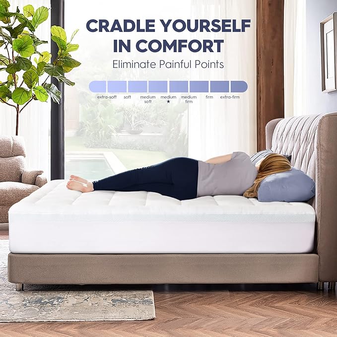 - 【Dual-layer Comfort Design】The dual-layer comfort design of the mattress topper provides the perfect balance of support and softness. This plush dual-layer mattress topper features 2 inches of cooling gel-infused memory foam and a 1 inch soft quilted down-alternative pillow top, it adds an extra layer of comfort, making you feel like sleeping in the cloud. Please enjoy the embrace feeling and soft support with our fluffy memory foam mattress topper.