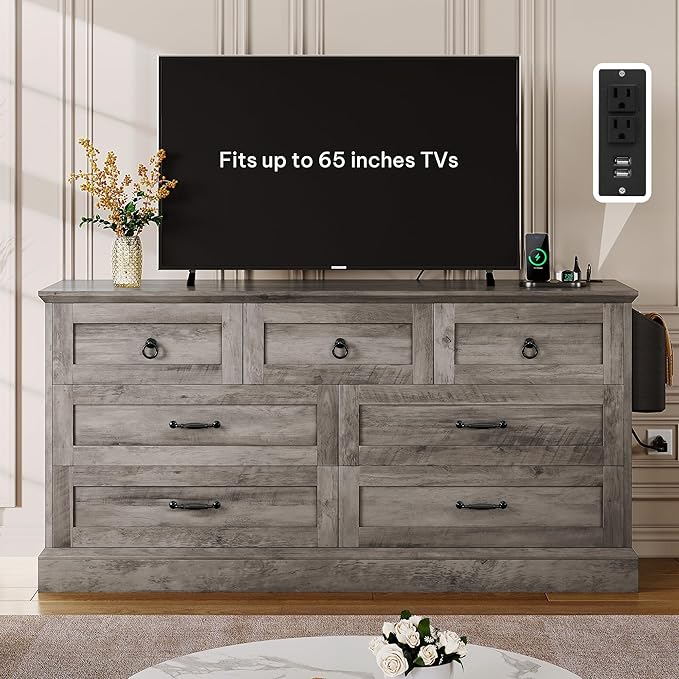 - Limitless Versatility: Featuring 7 spacious drawers with inward detailing and a handy side organizer, this dresser is a true multitasker. Use it as a stylish hallway cabinet, a functional TV stand in the living room, or a chic storage dresser