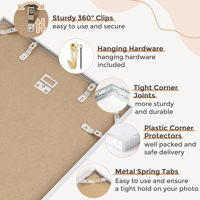 - Flexible Mat Size: Fit any photo you want with our flexible mat size! Display an 12x18 photo or use the mat to fit a 8.5x11 photo. The display size is 8 x 10.5 with the mat and 11.5x17.5 without it, giving you complete flexibility to display your photos your way. With hanging hardware and easy clip fasteners, you can customize the display of your photos to fit your space and style