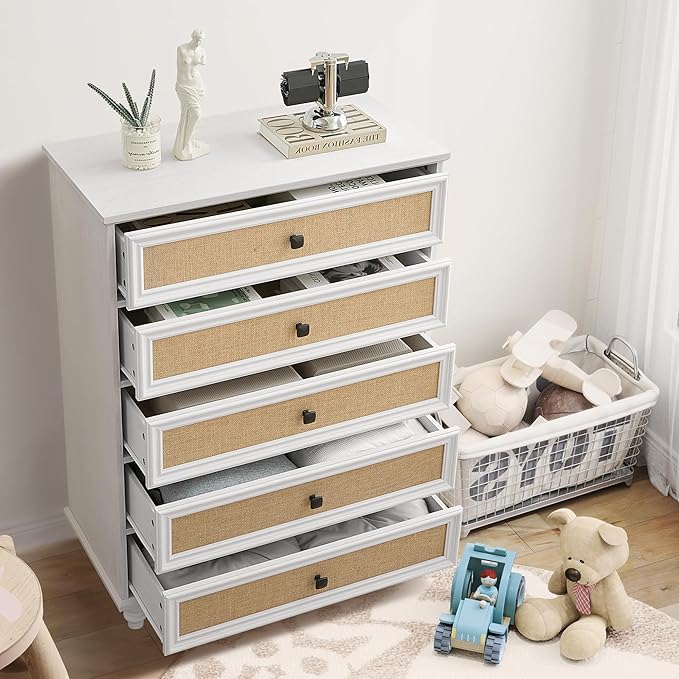 5 Drawer Dresser for Bedroom, Mid Century Modern Wide Wood Rustic Chest of Drawers Wooden Storage Organizer Dressers with Burlap Rattan Drawers for Living Room, Hallway Closet, Entryway, Beige White