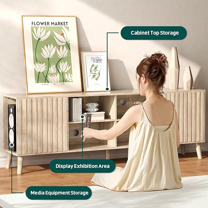 - Elegant, Mid-Century Design that Complements Your Space: With sleek fluted grooves on both sides, this Mid-Century Modern TV stand isn’t just furniture—it’s a statement piece that brings warmth and style to any room, fitting perfectly in both classic and modern decor.