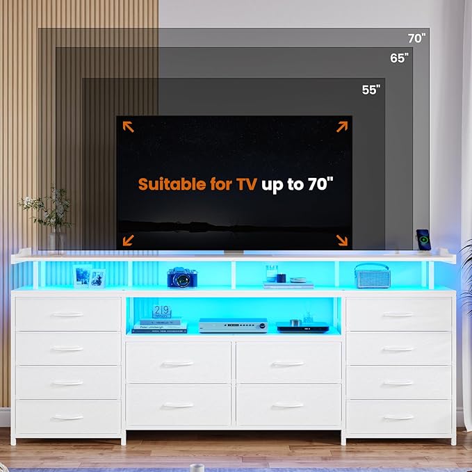12 Drawers TV Stand Dresser for 65/70 inch TV, Entertainment Center with LED Lights & Power Outlets, 63" Large LED TV Stand, TV Console for Bedroom