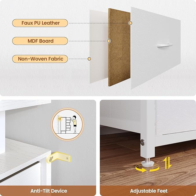 - Sturdy & Durable: Made of premium fabric, duable wooden top, sturdy metal frame, this tv stand dresser for long lasting using.While euaiped with anti-tipping kit enhanced stability and safety.It also features balanced adjustable feet prevent your floors from scratches and keep it stable on uneven floors meanwhile eliminate noise.