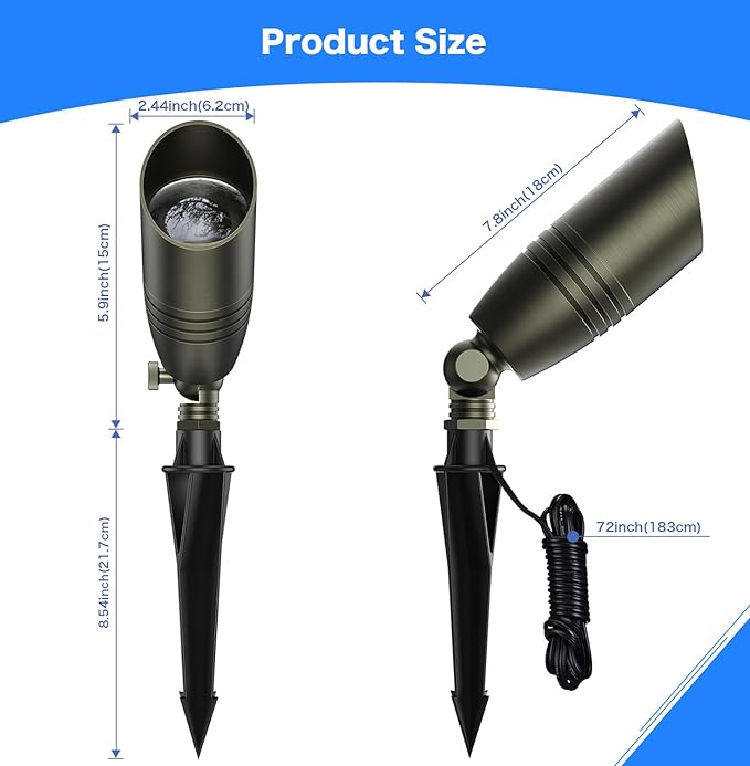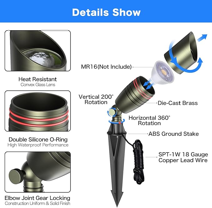 - ๐ฏ ๐ท๐น๐ฌ๐ช๐ฐ๐บ๐ฐ๐ถ๐ต ๐จ๐ซ๐ฑ๐ผ๐บ๐ป๐ด๐ฌ๐ต๐ป & 5-๐ด๐ฐ๐ต ๐ฐ๐ต๐บ๐ป๐จ๐ณ๐ณ: Direct light โexactly where neededโ with โ360ยฐ horizontal and 200ยฐ vertical rotation. Our Brass Landscape Lighting Achieve โperfect wall wash, tree uplighting, or โflagpole illuminationโ without moving the base. Includes โ6ft pure copper cable, heavy-duty ground stake, and quick-connect system โ โfully installed in minutes