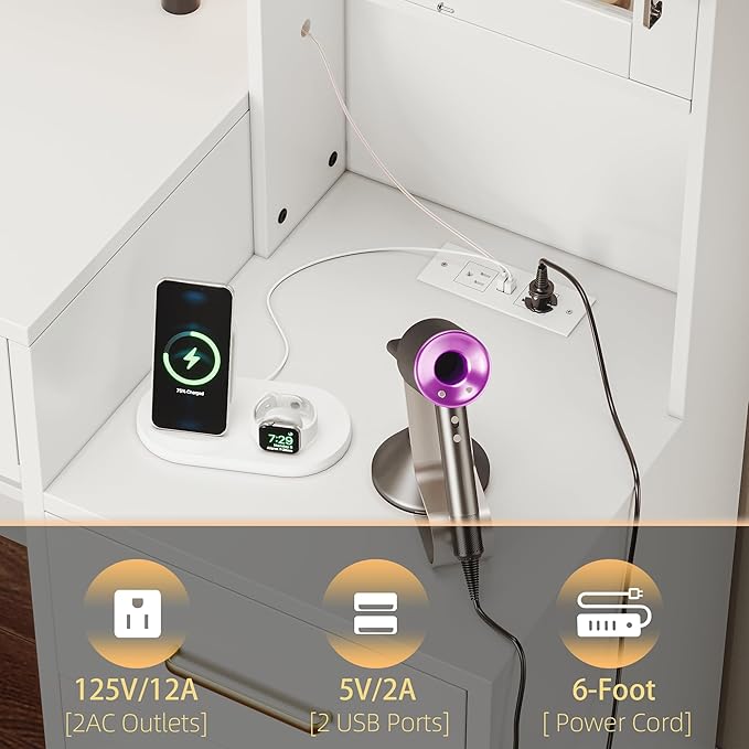 - 【Vanity Table with Charging Station】The vanity features a charging station above the tabletop, including 2 standard plug sockets and 2 USB ports. You can easily use hair dryer, curling iron in front the mirror, and charge your phone during makeup.