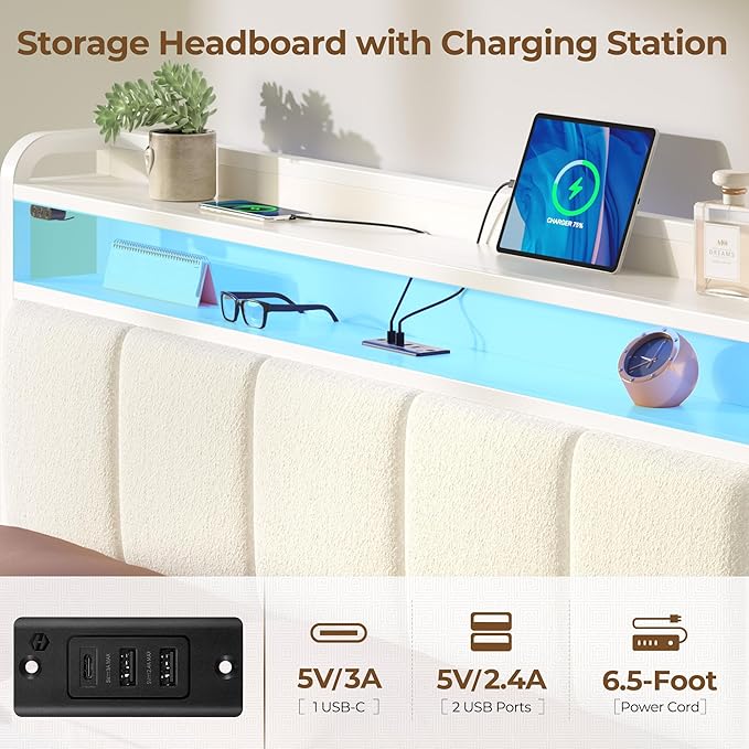 - Headboard with Charging Station: 2 USB and 1 Type C power strip was built into this bed frame headboard. No worry about the low battery, this charging station is convenient to charge your tablet, phone, or other mobile devices
