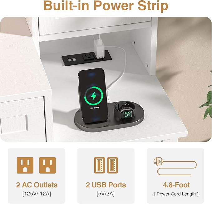 - White Vanity with Charging Station: The makeup vanity desk features a charging station, includes 1 Type-C port, 2 standard plug sockets and 2 USB ports, which it easier to use your hair dryer, and curling iron, and it can also charge your phone, tablet or other mobile devices.